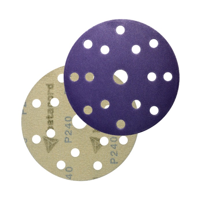 Абразивные круги Betacord Charoit P240 с подложкой из латексной бумаги и современным абразивным зерном в виде смеси керамики и обожженного оксида алюминия для шлифования "по сухому". Круги снабжены 15 отверстиями для пылеудаления и креплением на "липучке".