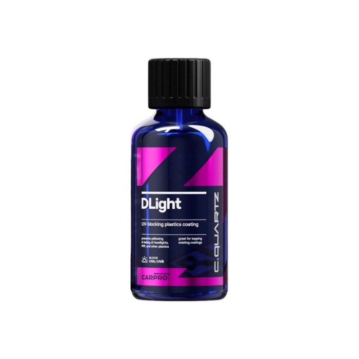CQUARTZ DLight — инновационное покрытие для защиты фар, PPF и других пластиков от ультрафиолетовых лучей. Благодаря мощным УФ-поглотителям и светостабилизаторам, оно блокирует вредные UVA и UVB лучи в диапазоне 260–360нм., предотвращая пожелтение, выцветание и растрескивание.