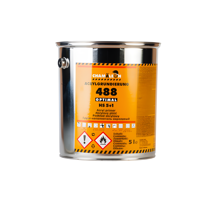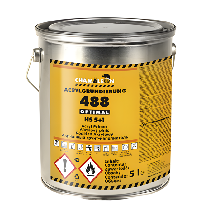 Акриловый грунт-наполнитель Chamaeleon 5:1, HS, 5л. - 488 2-х компонентный High Solids грунт-наполнитель. Композиция на основе функционально-замещенного акрилового сополимера. HS грунт-выравниватель с высокой коррозионной стойкостью, превосходной заполняющей способностью и хорошей адгезией, применяющийся в автомобильном ремонте.