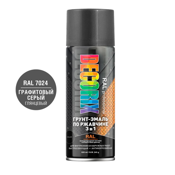 Decorix Аэрозольная грунт-эмаль по ржавчине «3 в 1» professional, глянцевая, объем баллона 520мл.