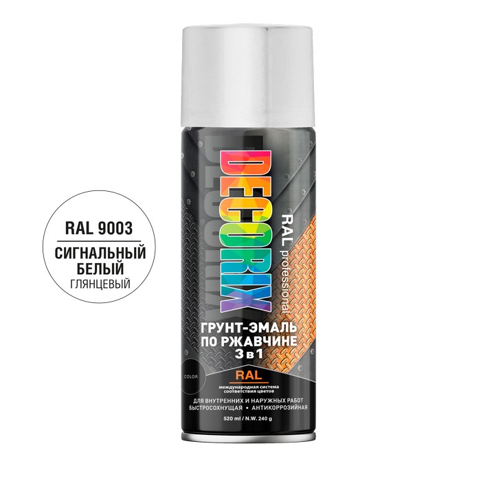 Грунт-эмаль по ржавчине «3 в 1» RAL PROFESSIONAL DECORIX. В качестве эталона используется каталог цветов RAL CLASSIC K7 (глянцевый). Контроль воспроизводимости цвета осуществляется спектрофотометрическим методом с учётом допустимых норм отклонений (dE) по существующим ГОСТ и ТУ.