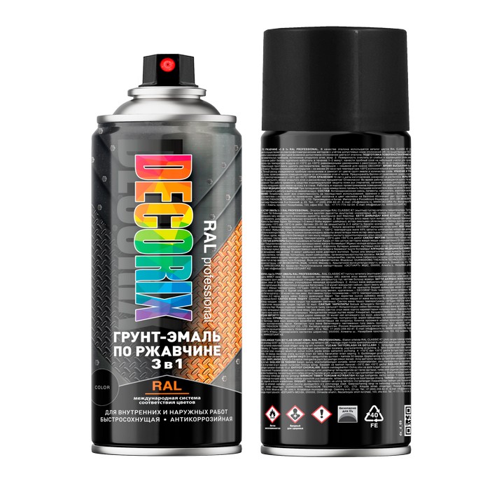 Грунт-эмаль по ржавчине «3 в 1» RAL PROFESSIONAL DECORIX. В качестве эталона используется каталог цветов RAL CLASSIC K7 (глянцевый). Контроль воспроизводимости цвета осуществляется спектрофотометрическим методом с учётом допустимых норм отклонений (dE) по существующим ГОСТ и ТУ.