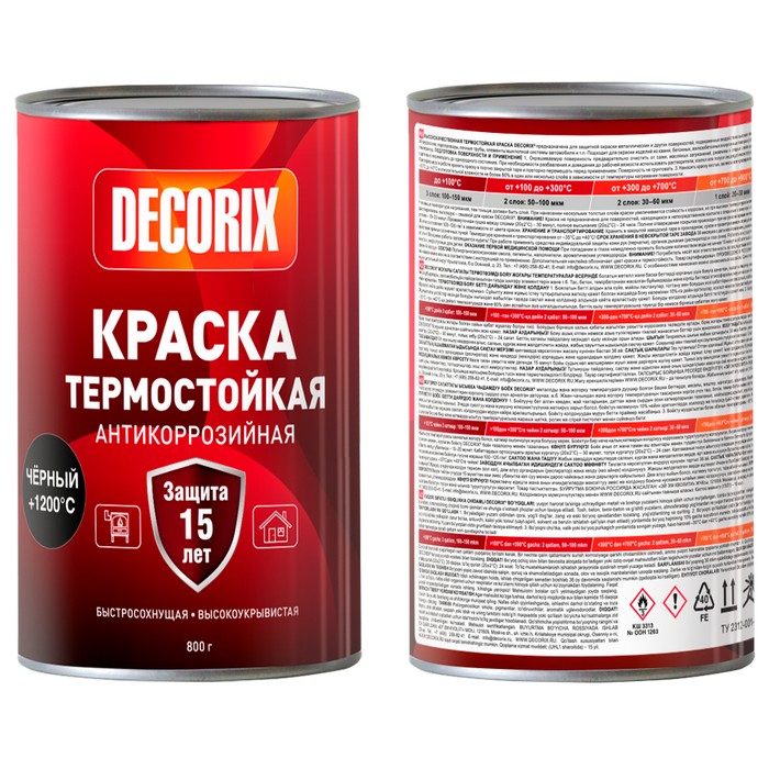 Высококачественная термостойкая краска DECORIX® предназначена для защитной окраски металлических и других поверхностей, подверженных воздействию высоких температур, таких как печи, мангалы, камины, барбекю, котельное оборудование, паропроводы, печные трубы, элементы выхлопной системы автомобиля и т.п. Подходит для окраски изделий из камня, бетонных, железобетонных и кирпичных поверхностей для защиты от атмосферных осадков и воздействия высоких температур.