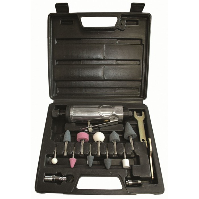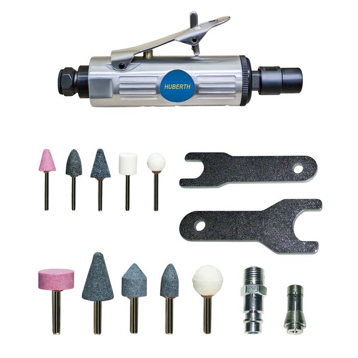 Пневматическая зачистная машинка Huberth идет в комплекте с набором ключей, разъемов и шлифовальных насадок (14 шт).