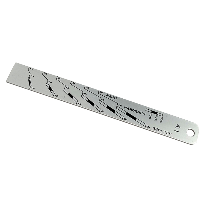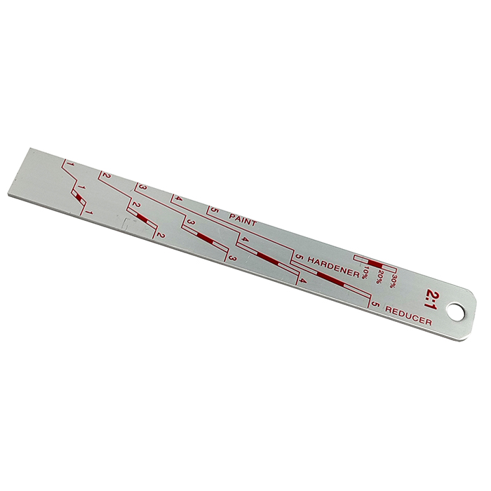 Алюминиевая мерная линейка ИНТЕРКОЛОР 2:1 / 4:1 длиной 20см. для разведения и смешивания двухкомпонентных лакокрасочных материалов в пропорции 2:1 и 4:1 с отвердителем. Шкала линейки изготовлена с применением стойких к органическим растворителям красок. Для разведения и смешивания используются обе стороны линейки.