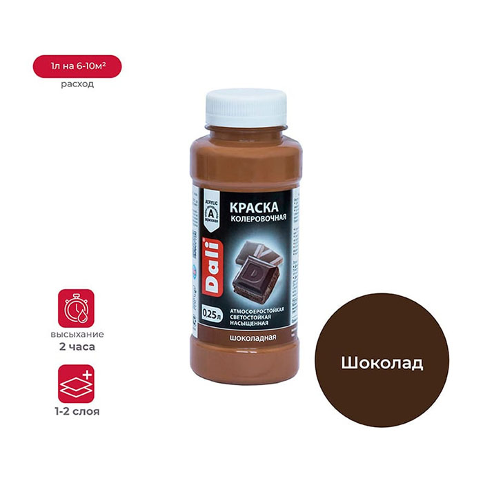 Способ применения: Перед использованием тщательно встряхнуть. При самостоятельном применении поверхность должна быть сухой и чистой. Краску наносить в 2 слоя с промежуточной сушкой 1 час. Для колеровки водно-дисперсионных материалов добавлять краску небольшими порциями, тщательно перемешивая до получения нужного оттенка. Для точного подбора цвета рекомендуется использовать Карту цветов колеровочной краски. Наносить кистью, валиком или распылителем при температуре не ниже +10°C и влажности воздуха не более 80%.