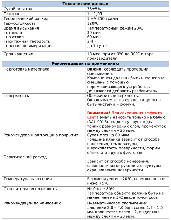 Внимание! Для сохранения эффекта цвета эмаль наносить только на белую (RAL-9016) подложку-грунт в два тонких равномерных слоя, промежуток между слоями – 20 мин.