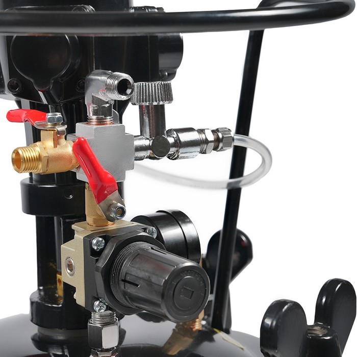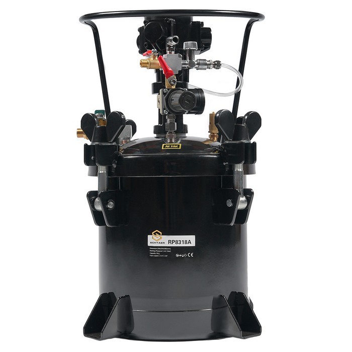 Красконагнетательный бак SCH RP8318A, произведенный компанией SCHTAER, представляет собой профессиональное оборудование для работы с лакокрасочными материалами. Этот черный бак объемом 10 литров оснащен автоматической мешалкой, обеспечивающей равномерное перемешивание краски, что особенно важно при работе с многокомпонентными составами.