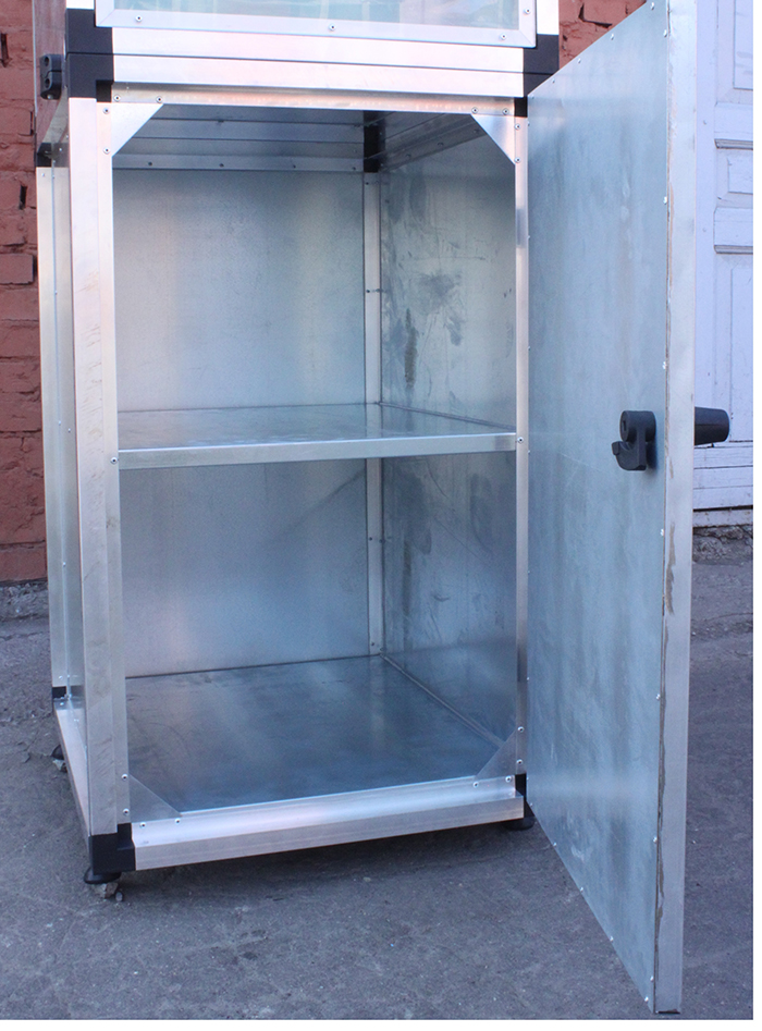 -Материал: каркас - алюминиевый профиль, полки и стенки – оцинкованная сталь.