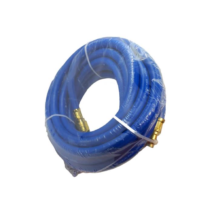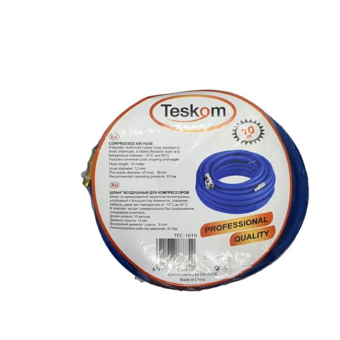 Шланг воздушный армированный, Teskom D 9×12 mm, длина 15м, евростандарт, синий, оснащен быстросъемными соединителями и предназначен для подключения пневматического оборудования к компрессору, рабочее давление до 20 бар.