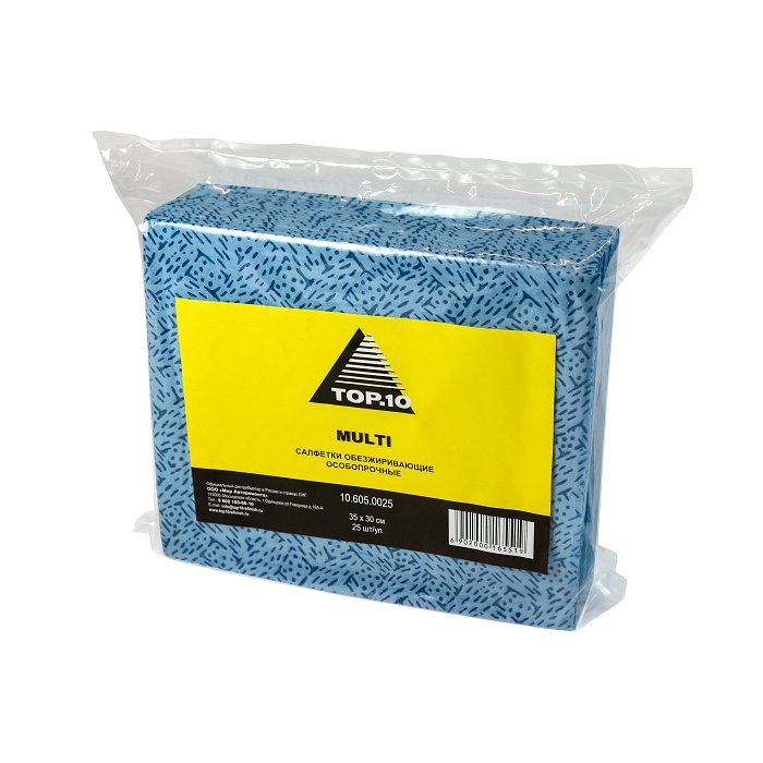 Особо прочная салфетка TOP.10 MULTI размером 35х30см. для протирки, обезжиривания и сбора пролившейся жидкости. Изготовлена из нетканого материала на основе волокон полипропилена. Материал салфетки отличается большой впитывающей способностью, прочностью и отсутствием ворса. Применяется для очистки разнообразных поверхностей от масляных, жировых и прочих загрязнений, а также сбора растворителей и других разлившихся жидкостей. Может быть использована в автомастерских, в пищевой и металлообрабатывающей промышленности, полиграфии, самолетостроении и т.п.