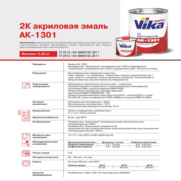 Двухкомпонентная акриловая автоэмаль для окраски кузовов и пластмассовых деталей автомобилей; может применяться для окраски крупногабаритных транспортных средств.