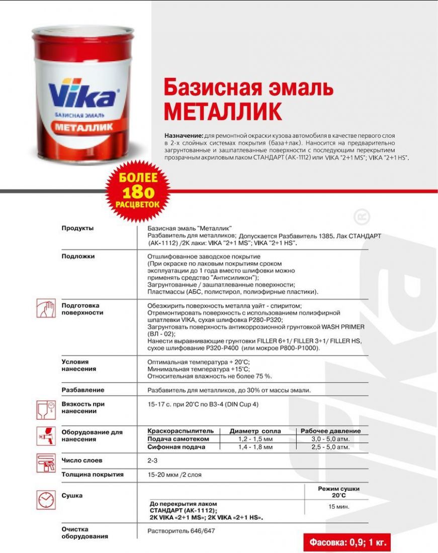 -Базисная эмаль VIKA металлик предназначена для окраски загрунтованной и зашлифованной поверхности в комплексе с прозрачным лаком.