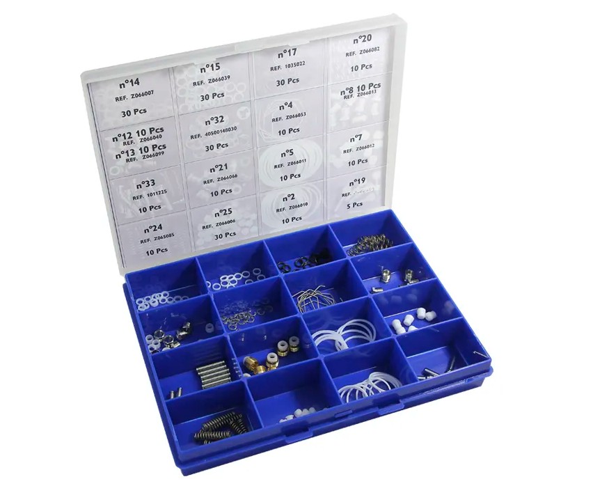 Набор запасных частей в боксе для краскопультов EGO HVLP. Пластиковый бокс содержит 16 отделений для наиболее часто используемых запчастей краскопульта. Габариты: 240х180х35 мм