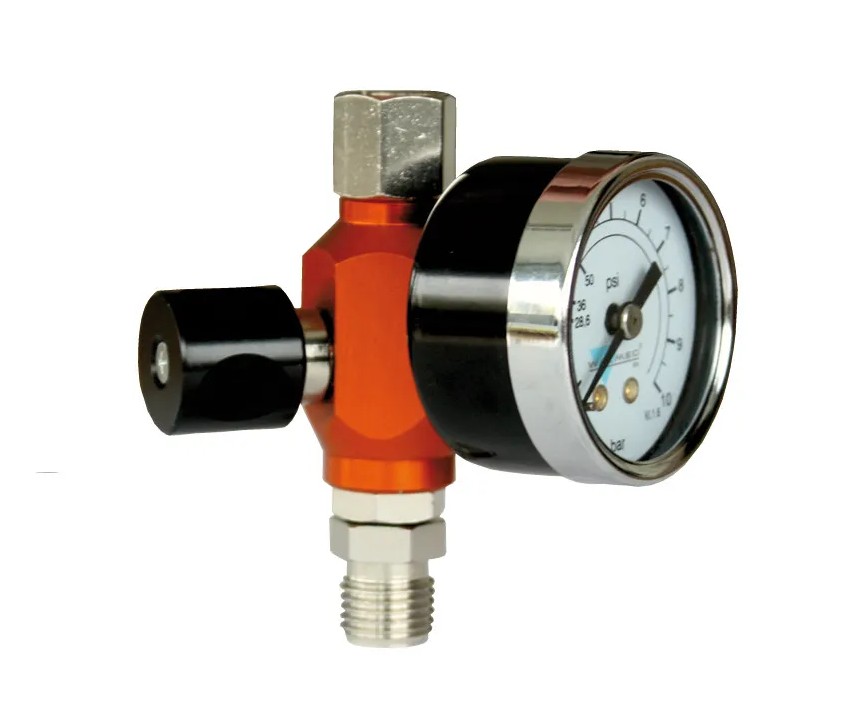 Регулятор давления для краскопультов прямоточный (с большой пропускной способностью) с манометром. Комплектация (в сборе): 1. Манометр с осевым креплением М 1/8", (Ø 40 мм, с двойной шкалой 0 -10 бар/0 -140 Psi). 2. Редуктор: соединение: F 1/4" / М 1/4".