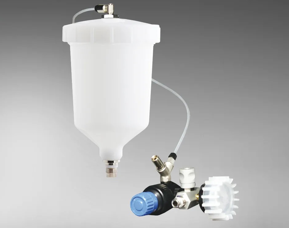 Верхний бачок под давлением (для нанесения ЛКМ высокой вязкости) с регулятором давления и манометром . Для краскопультов Slim ( HVLP, HTE, HTE SR). Совместим с краскопультами: Slim XLight, Asturomec 10011, 10011 Gel Coat, 6011, 9011, 9011 Gel Coat, OM, UR/S PLUS. Объём: 680 мл. Материал: нейлон. Резьба: М12х1.
