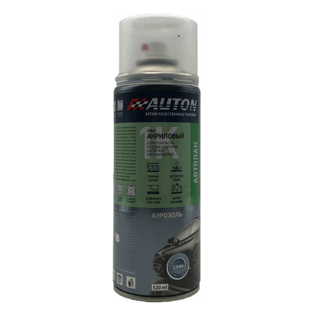 Auton Лак акриловый, глянцевый, в аэрозольном баллоне, объем 520мл. предназначен для создания глянцевого защитного покрытия при ремонтной окраске кузова автомобиля эмалями «металлик», а также для придания декоративного блеска окрашенным и неокрашенным подготовленным поверхностям из дерева, металла, камня и пластика.