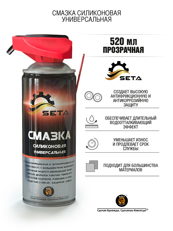 East Brand SETA Silicone S1001 Смазка проникающая быстродействующая, 200гр. Один режим распыления через трубочку. Два режима распыления: через клапан в сложенном виде как на фото и через трубочку в поднятом состоянии.