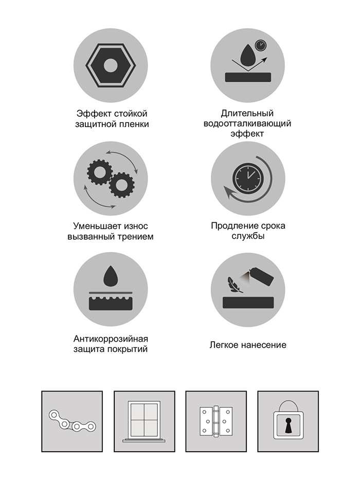 Применяется для полировки и обновления приборных панелей, шин, резиновых деталей, для смягчения и защиты кожаных изделий и т. п. Обладает водоотталкивающим действием, предотвращает оседание пыли и грязи. Также используется для смазывания трущихся деталей, ремней, аккумуляторных проводов, прессформ. Обволакивает детали узлов, устраняет трение и скрип. В быту применяется для смазывания дверных петель, замков и мн.др. Может наноситься в труднодоступные места. Не содержит растворителей. Не имеет неприятного запаха. Не содержит озоноразрушающих веществ.