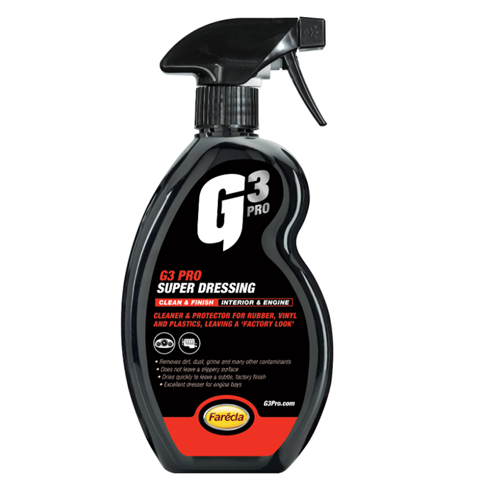 Консервант G3 Pro Super Dressing удаляет грязь, пыль, шоколад и многие другие стойкие загрязнения, не оставляя скользкой поверхности. Быстро высыхает, оставляя сатиновый блеск "новой детали".