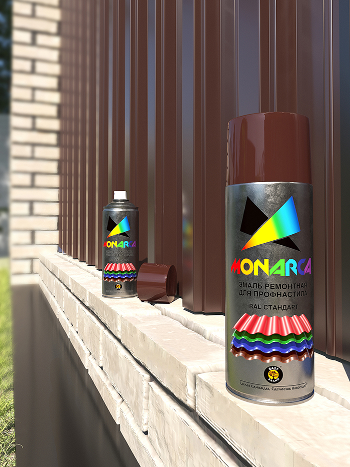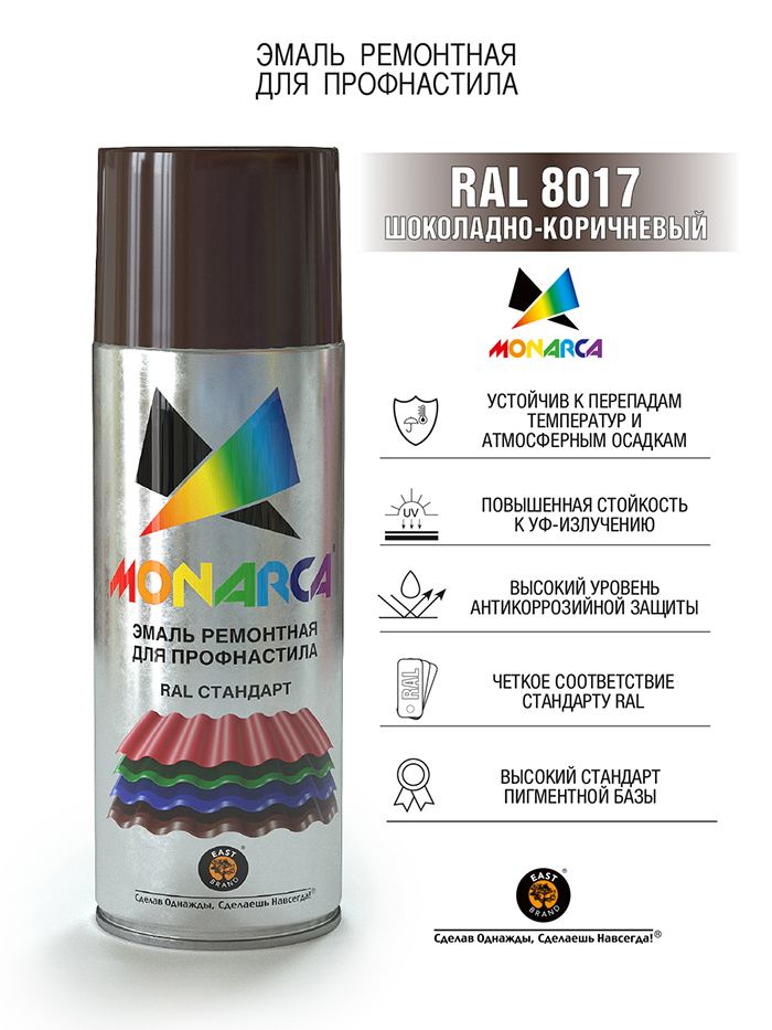 Monarca Аэрозольная краска для профнастила, название цвета "Шоколадно-коричневый", глянцевая, RAL8017, объем 520мл.