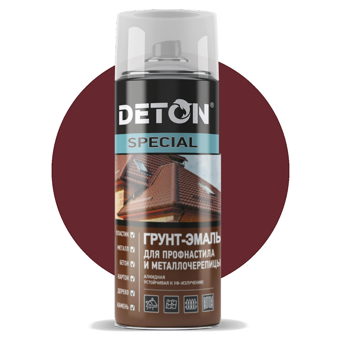 Deton Special Грунт-эмаль алкидная, название цвета "Красное вино", RAL3005, в аэрозольном баллоне, объем 520 мл. Высококачественная универсальная быстросохнущая алкидная атмосферостойкая эмаль - предназначена для финишной отделки предварительно загрунтованных поверхностей.