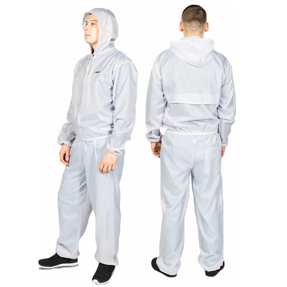 Куртка + брюки. Состав: 100% полиэстер. Вентиляция на спине и в области подмышечных впадин. Внешний карман сзади на штанах. Удобная регулировка на капюшоне. Антистатический материал, без силикона.
